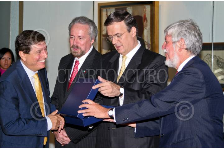 MÉXICO, D.F., 06SEPTIEMBRE2010.- Marcelo Ebrard Casaubón, Jefe de Gobierno del Distrito Federal, recibió un obsequio por parte del director general de Iberia, Manuel Antonio López Aguilar, antes de realizar el bautizo del nuevo avión Airbus A340-600 de la aerolínea Iberia el cual porta el nombre de "Ciudad de México" y realizará viajes España-México-España. Esto se realizó hoy 6 de septiembre de 2010 en el Aeropuerto Internacional Benito Juárez de la Ciudad de México. Lo acompañan Héctor Velázquez, director general del Aeropuerto Internacional de la Ciudad de México y el Embajador de España en México, Manuel Alabart. FOTO: MISAEL VALTIERRA/CUARTOSCURO.COM