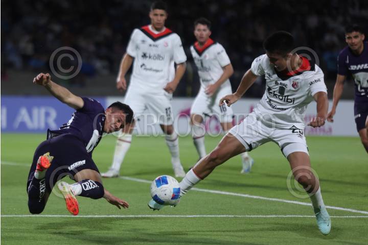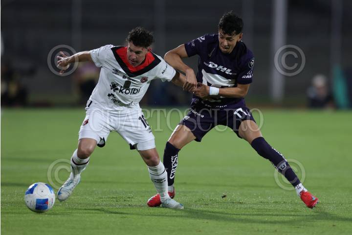 CIUDAD DE MÉXICO, 04MARZO2025. Bryan Oviedo disputa una pelota a Jorge Ruvalcaba durante el partido de fútbol Pumas vs Alajuelense correspondiente a la ida de los octavos de final de la Copa de Campeones de la Concacaf, en el Estadio Olímpico Universitario. FOTO: EDGAR NEGRETE LIRA/CUARTOSCURO.COM