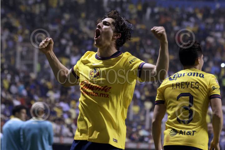 PUEBLA, PUEBLA, 6NOVIEMBRE2024.-  Alan Cervantes en festejo de gol durante el partido entre las Aguilas del America y los Tuzos del Pachuca, correspondiente a la jornada 16 del torneo Apertura 2024 de la Liga BBVA MX, celebrado en el Estadio Cuauhtémoc.  FOTO: MIREYA NOVO/ CUARTOSCURO.COM