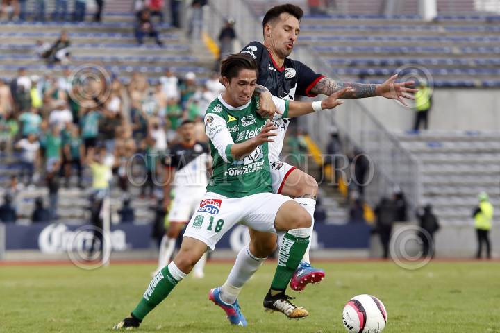PUEBLA, PUEBLA, 30SEPTIEMBRE2017.- Los jugadores Alan Cervantes y Alfonso Tamay disputan el balón durante jugada del partido entre Lobos BUAP y el Club León con marcador final 0-3 correspondiente a la jornada 12 del torneo de Apertura de la Liga MX. FOTO: HILDA RÍOS /CUARTOSCURO.COM