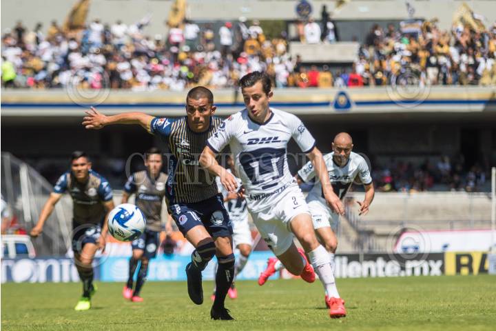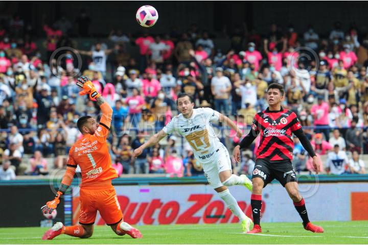 Alan Mozo (Pumas) disputa un balón en el partido ante los Xolos de Tijuana.