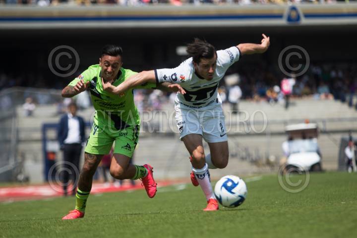 Martín Rodríguez (Monarcas) y Alan Mozo (Pumas) disputan un balón en el medio campo