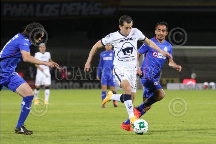 Alan Mozo (Pumas) desborda a varios jugadores del Cruz Azul durante el encuentro de vuelta de semifinales.