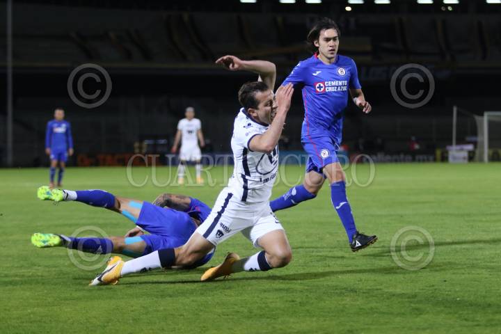Alan Mozo (Pumas) es derribado con una falta muy cerca del área chica del Cruz Azul, durante el encuentro de semifinales del torneo Guard1anes de la Liga MX.