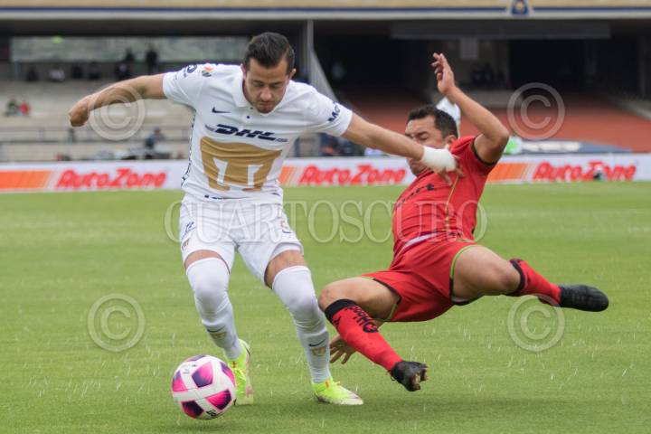 Rubens Sambueza delantero de los Diablos Rojos del Toluca y Alan Mozo defensa de Pumas de la UNAM, en busca del pase a Cuartos de Final del Torneo Grita México Apertura 2021.