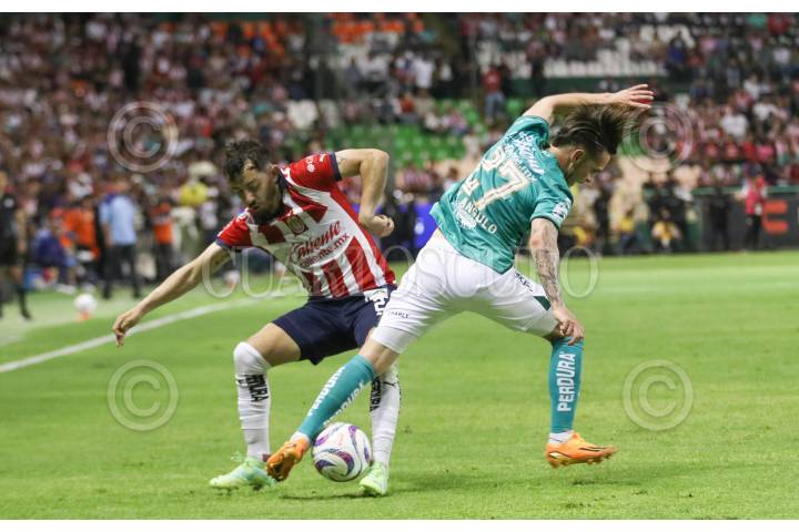 Alán Mozo (Chivas) intenta eludir a un jugador de León, durante la jornada de la Liga MX.