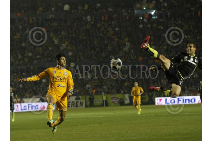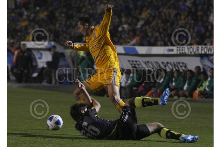 MONTERREY, NUEVO LEÓN, 08FEBRERO2014.- Alan Pulido del equipo de los Tigres disputa el balón contra Rafael Figueroa del equipo de los Santos Laguna en el estadio universitario en el partido de la jornada 6 de la Liga MX. FOTO: GABRIELA PÉREZ MONTIEL / CUARTOSCURO.COM