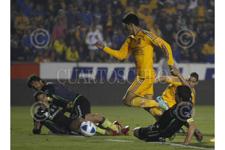MONTERREY, NUEVO LEÓN, 08FEBRERO2014.- Alan Pulido del equipo de los Tigres disputa el balón contra jugadores del equipo de los Santos Laguna en el estadio universitario en el partido de la jornada 6 de la Liga MX. FOTO: GABRIELA PÉREZ MONTIEL / CUARTOSCURO.COM