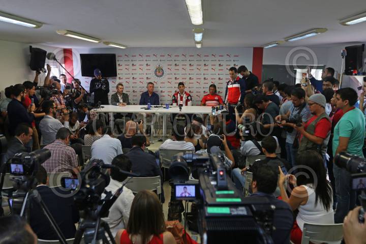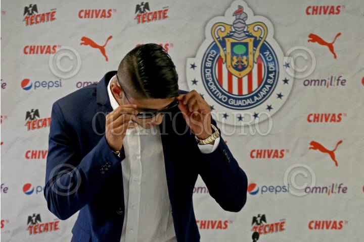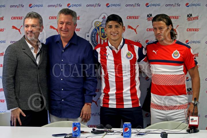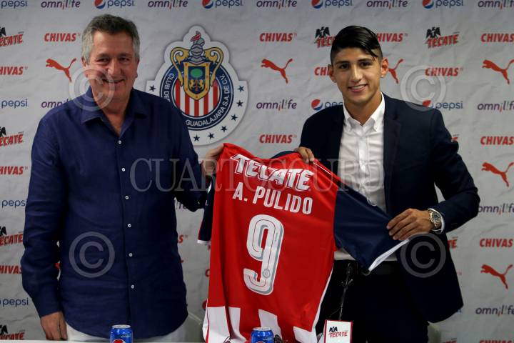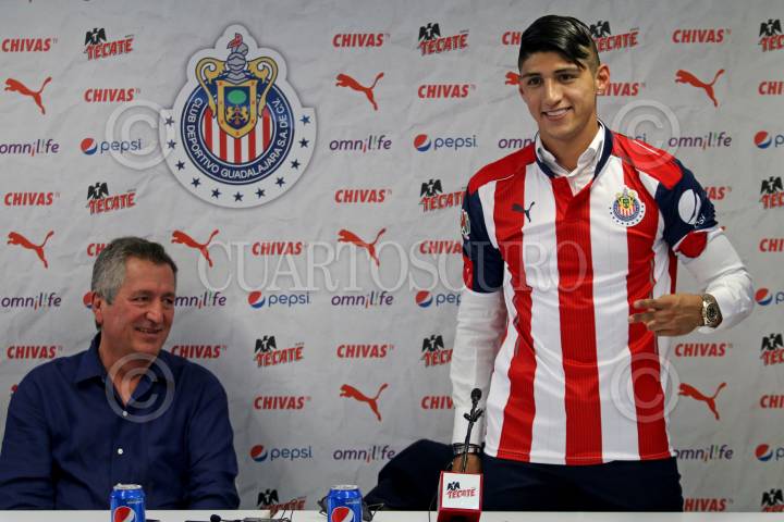 ZAPOPAN, JALISCO, 31AGOSTO2016.- El jugador mexicano Alan Pulido, quien milito dos años en el club Griego Olympiakos, fue presentado por el Club Deportivo Guadalajara este medio día en Verde Valle, dicha presentación estuvo a cargo del el propietario del Club, Jorge Vergara Madrigal, el Director Técnico, Matías Almeida y el Director del Grupo Omnilife-Chivas, José Luis Higueras. FOTO : FERNANDO CARRANZA GARCIA / CUARTOSCURO.COM