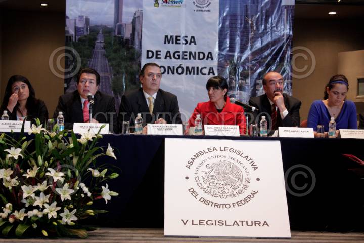 MÉXICO, D.F., 09NOVIEMBRE2009.- Aleida Alavez Ruiz, Mario Delgado, secretario de Finanzas, Marcelo Ebrard Casaubón, jefe de gobierno del D.F., Alejandra Barrales Magdaleno, presidente de la Comisión de Gobierno, Jose Angel Avila, subsecretario de gobierno y Mariana Gómez del Campo, diputada local del PAN en D.F. durante la presentación de iniciativas económicas a asambleístas del D.F., en un hotel de la ciudad. FOTO: ESSENE HERNÁNDEZ/CUARTOSCURO.COM