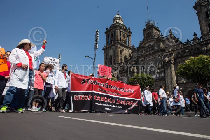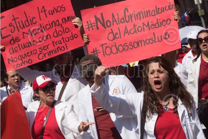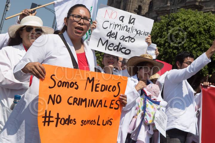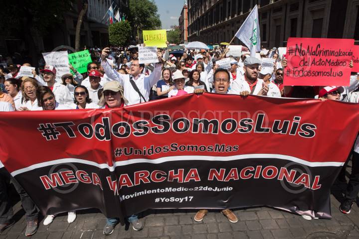 CIUDAD DE MÉXICO, 08ABRIL2018.- Médicos de diferentes hospitales de la República se manifestaron el día de hoy por las calles del Centro Histórico y frente a Palacio Nacional, para exigir al presidente Enrique Peña Nieto la liberación del traumatólogo Luis Alberto Pérez Méndez, quien hace unos días en el estado de Oaxaca tuvo que intervenir quirurgicamente de urgencia a un menor de edad quien falleció en el quirófano. Dadas las circunstancias el médico fue acusado de negligencia y de homicidio doloso y se encuentra en prisión al día de hoy. La causa del fallecimiento del infante se debió a una reacción inesperada por la anestesia. FOTO: TERCERO DÍAZ /CUARTOSCURO.COM