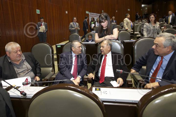 MÉXICO, D.F., 04NOVIEMBRE2014.- Los diputados del PT Manuel Rafael Huerta Ladrón de Guevara, Alberto Anaya Gutiérrez y Ricardo Cantú Garza, conversan con el priista Manlio Fabio Beltrones, en la sesión de la Cámara de Diputados. FOTO: ARMANDO MONROY /CUARTOSCURO.COM