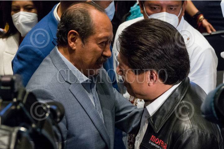 Leonel godoy Rangel, diputado de Morena por el distrito 01, y Mario Delgado durante la reunión entre diputadas y diputados electos de Morena, PT y PVEM.