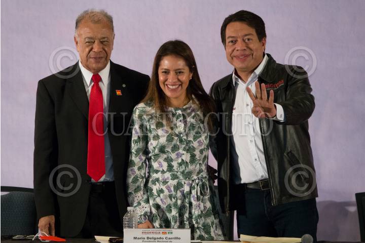 Alberto Anaya Gutiérrez, Mario Delgado, y Karen Castrejón Trujillo durante la conferencia de prensa y reunión con diputadas y diputados electos de Morena PT y PVEM.