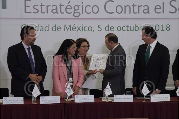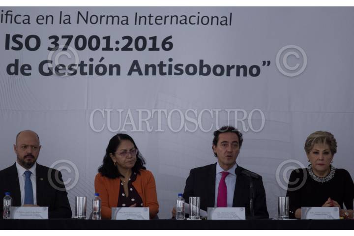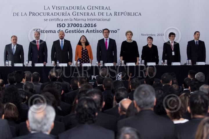 CIUDAD DE MÉXICO, 28NOVIEMBRE2018.- Roberto Andrés Ochoa Romero, subprocurador de Control Regional Procedimientos Penales y Amparo; Patricia Bugarin Gutiérrez, coordinadora Nacional, titular de la Comisión Nacional de Seguridad, y Alberto Elías Beltrán, subprocurador Jurídico y de Asuntos Internacionales de la Procuraduría General de la República (PGR), y Adriana Campos López, visitadora general de la procuraduría, durante la entrega de certificado de la Norma Internacional ISO 37001:2016 “Sistema de Gestión Antisoborno”. Con esta medida se busca la mejora en la perspectiva que la sociedad tiene hacia las instituciones. FOTO: GALO CAÑAS /CUARTOSCURO.COM