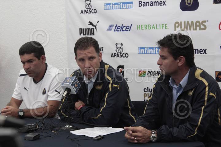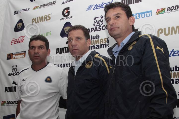 MÉXICO, D.F., 25MAYO2012.- El Director Deportivo de los PUMAS de la UNAM, Alberto García Aspe y el Presidente del Club, Jorge Borja Navarrete, presentaron, en el Estadio México 68, al nuevo director del equipo de futbol, Joaquín del Olmo la tarde de hoy. El timonel Felino anunció a sus equipo que lo acompañara y la contratación será por un año con el compromiso de que el equipo auriazul pase a la liguilla en la siguiente temporada. FOTO: FRANCISCO RODRÍGUEZ /CUARTOSCURO.COM