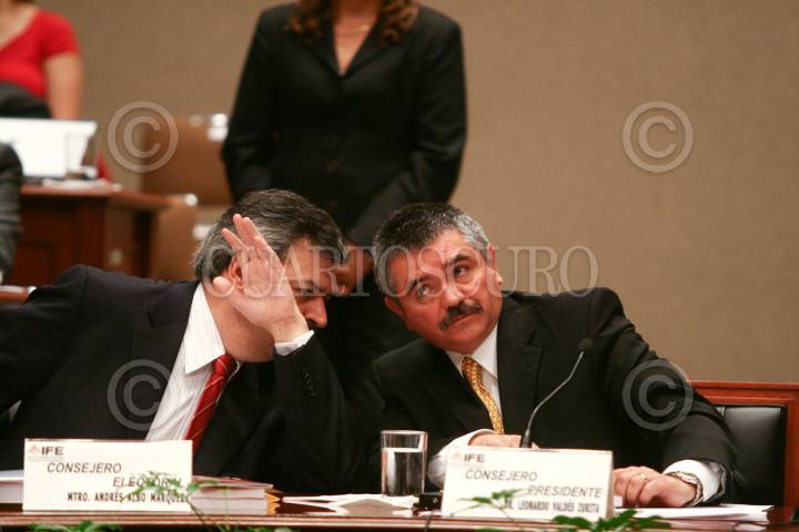 MÉXICO, D.F., 18JUNIO2008.- El consejero presidente Leonardo Valdés Zurita y el consejero Andrés Albo, durante la sesión de dicho Instituto, donde se determino una sanción de 894 mil 30 pesos al PRD, por violar el Cofipe al usar la frase "presidente legítimo" en referencia a Andrés Manuel López Obrador. FOTO: ISAAC ESQUIVEL/CUARTOSCURO.COM