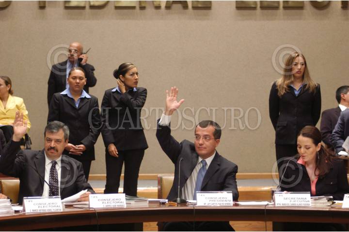 MÉXICO, D.F. 18ABRIL2007.- Los consejeros Alejandra Latapí, Marco Antonio Gómez y Andrés Albo Márquez durante una votación en la sesión extraordinaria del Instituto Federal Electoral. FOTO: PAOLA HIDALGO/CUARTOSCURO.COM