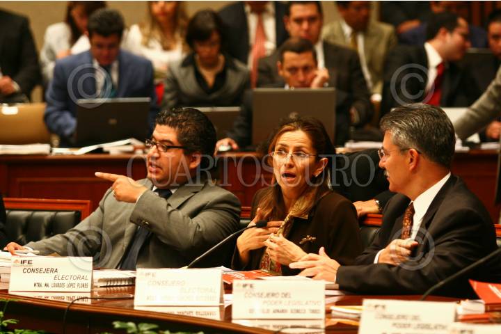 MÉXICO, D.F., 18JUNIO2008.- Los consejeros Marco Antonio Gómez Alcantar, María Lourdes del Refugio López Flores y Arturo Sánchez Gutierréz, durante la sesión de dicho Instituto, donde se determino una sanción de 894 mil 30 pesos al PRD, por violar el Cofipe al usar la frase "presidente legítimo" en referencia a Andrés Manuel López Obrador. FOTO: ISAAC ESQUIVEL/CUARTOSCURO.COM