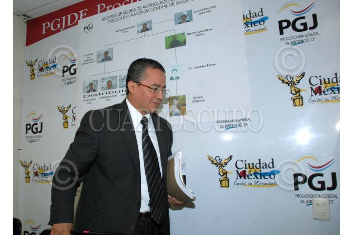 MÉXICO, D.F., 06NOVIEMBRE2009.- Oscar Montes de Oca, titular de la Agencia Central de Investigaciones de la PGJDF, durante de la presentación de ocho personas por su presunta participación en la fabricación y venta de los productos que se aplicaban en las clínicas de Valentina de Albornoz. FOTO: CUARTOSCURO.COM