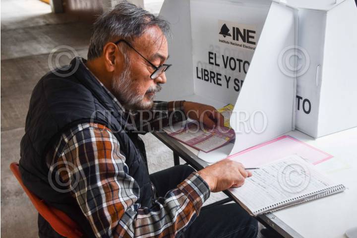 CIUDAD DE MÉXICO, 01JUNIO2025.- Un adulto mayor se respalda con un acordeón escrito por el mismo para decidir y emitir su voto en la boleta adecuada en las elecciones del Poder Judicial. Esto en una casilla correspondiente distrito 15 en la alcaldía Benito Juárez. FOTO: MARIO JASSO/CUARTOSCURO.COM