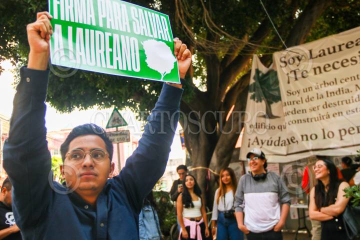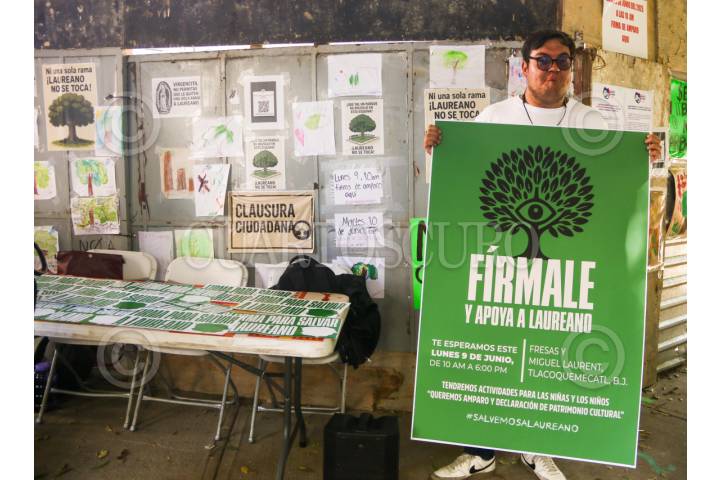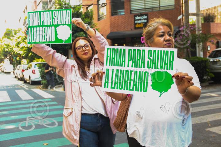 CIUDAD DE MÉXICO. 09MAYO2025.- Activistas y colonos de la calle Miguel Laurent de la alcaldía Benito Juárez, levantan carteles para evitar que sea talado el árbol laureano por parte de autoridades del Gobierno de la Ciudad para realizar una construcción. FOTO: VICTORIA VALTIERRA/CUARTOSCURO.COM