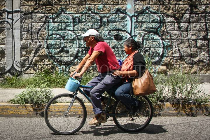 Pareja se traslada usando la bicicleta como medio de transporte en las calles de la alcaldía Tláhuac.