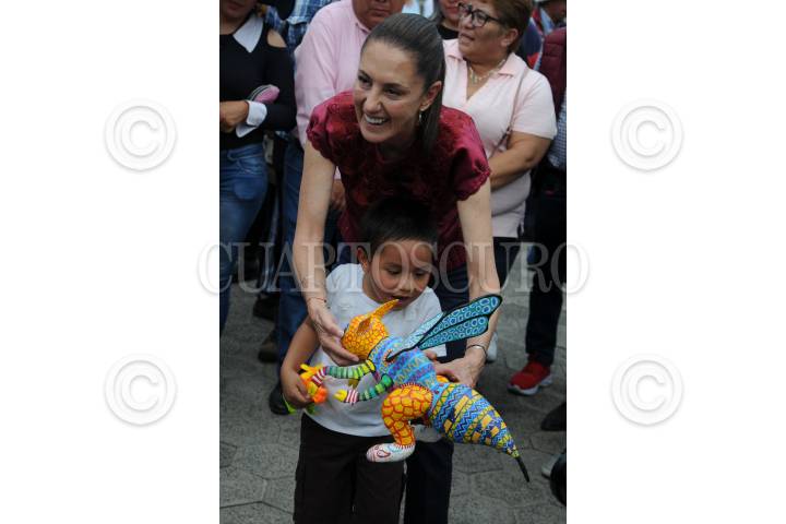 Claudia Sheinbaum, jefa de gobierno, muestra el alebrije que le obsequiaron a un niño.