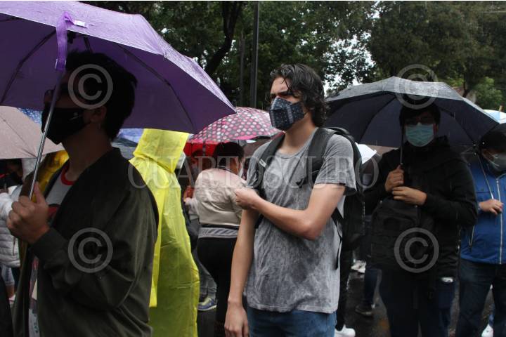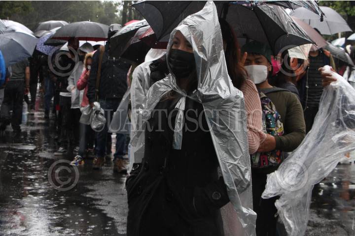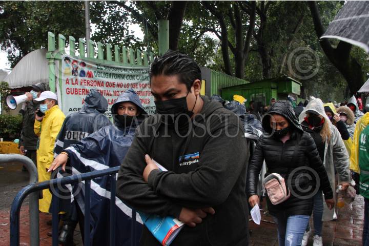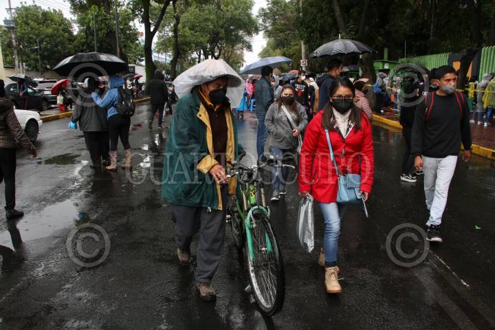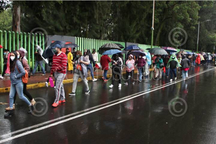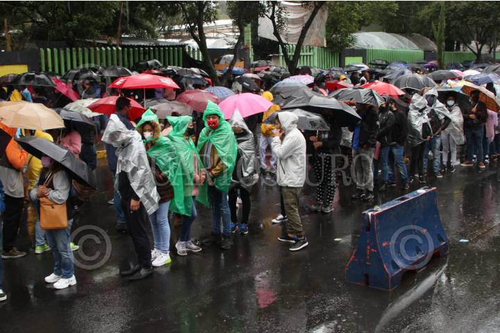 Bajo la lluvia, jóvenes y persona rezagadas abarrotan el Deportivo Xochimilco para la vacunación contra COVID-19.