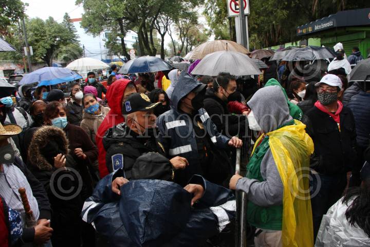 Aspectos de vecinos de Xochimilco en espera de su primera aplicación de la vacuna contra COVID-19.