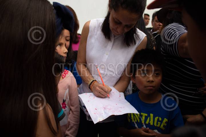 Claudia Sheinbaum Pardo, le escribe una dedicatoria a una niña durante la inauguración de PILARES