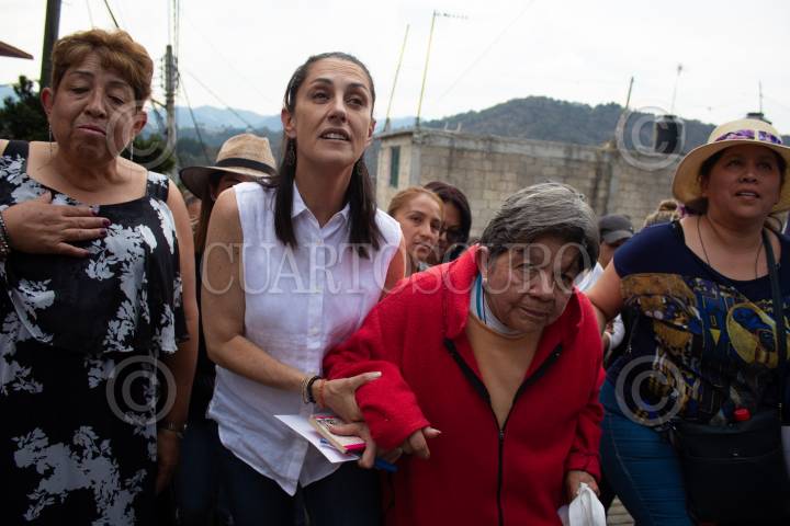 Claudia Sheinbaum Pardo, jefa de Gobierno, camina junto a una vecina de la tercera edad durante la inauguración de PILARES