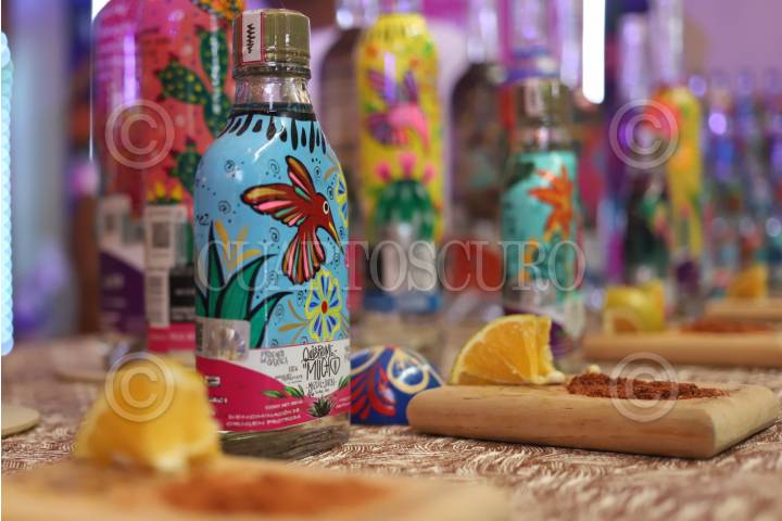 OAXACA, OAXACA, 20JULIO2025.- Un productor de Mezcal muestra una de sus botellas que se encuentra vendiendo dentro de la Feria del Mezcal 2025 como parte de las actividades de la Guelaguetza. FOTO: DANIEL AUGUSTO/ CUARTOSCURO.COM