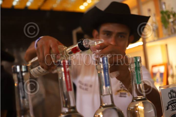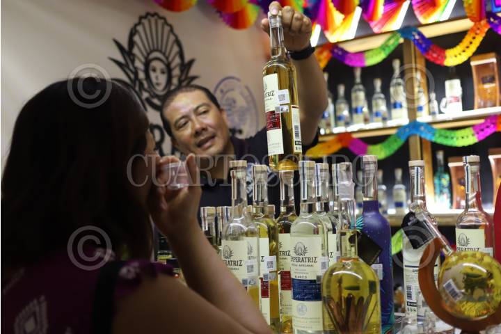 OAXACA, OAXACA, 20JULIO2025.-Un productor de mezcal ofrece pruebas de su bebida, la cual está en venta dentro de l Feria del Mezcal como parte de las actividades de la Guelaguetza. FOTO: DANIEL AUGUSTO/ CUARTOSCURO.COM