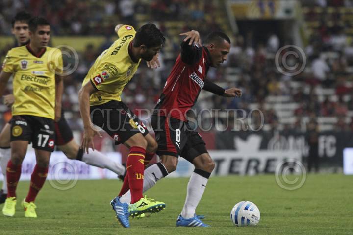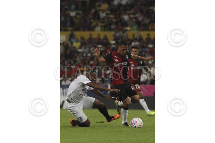 GUADALAJARA, JALISCO, 16AGOSTO2014.- Los Zorros del Atlas se enfrentaron a Leones Negros de la Universidad de Guadalajara con marcador final de un gol a cero a favor de Atlas en partido correspondiente a la Jornada 5 del Torneo Apertura 2014 de la Liga MX. En la imagen el jugador del Atlas, Aldo Leao disputa un balón frente al contrario de Leones, Félix Araujo. FOTO: FERNANDO CARRANZA GARCIA /CUARTOSCURO.COM