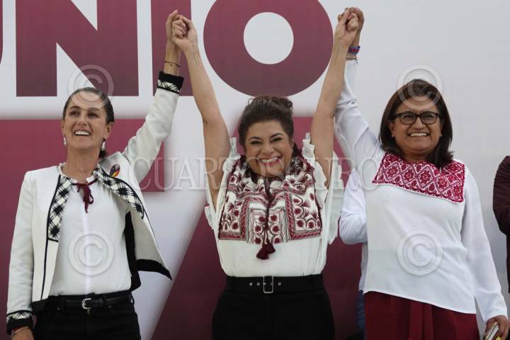 CIUDAD DE MÉXICO, 13MAYO2024.- Claudia Sheinbaum, candidata a la presidencia por la coalición "Sigamos haciendo Historia"; Clara Brugada, candidata a Jefatura de Gobierno, y Aleida Álavez, candidata a alcaldesa de Iztapalapa, durante un mitin en la Utopía Meyehualco, alcaldía Iztapalapa. FOTO: GRACIELA LÓPEZ /CUARTOSCURO.COM