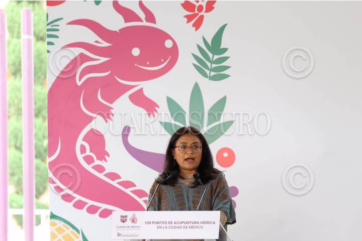 CIUDAD DE MÉXICO, 30JUNIO2025.- Aleida Alavez Ruiz, alcaldesa de Iztapalapa, durante la presentación de los 100 Puntos de Acupuntura Hídrica en la Ciudad de México, en la colonia Ampliación Emiliano Zapata, en la alcaldía Iztapalapa. Ahí la mandataria capitalina dio el banderazo de inicio de las obras de los captadores de lluvia pluvial para recargar el manto freático, esto para aprovechar las fuertes lluvias de este año, las cuales califico de históricas. FOTO: MOISÉS PABLO/CUARTOSCURO.COM