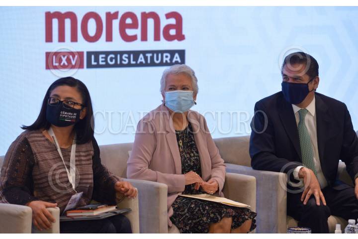 Aleida Alavez Ruiz; diputada de Morena, Olga Sánchez Cordero, secretaria de Gobernación, y Carlos Alberto Puente, diputado de PVEM, durante el segundo día de la reunión plenaria del grupo parlamentario de Morena de la Cámara de Diputados.