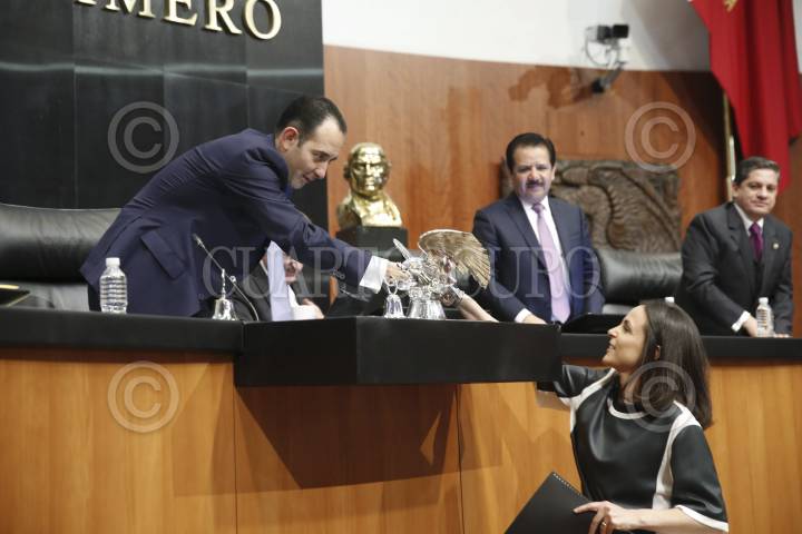 MÉXICO, D.F., 04NOVIEMBRE2015.- Roberto Gil Zuarth, presidente de la mesa directiva del Senado, saluda a Alejandra Palacios titular de la Comisión Federal de Competencia Económica, quien estuvo durante la sesión. FOTO: CUARTOSCURO.COM