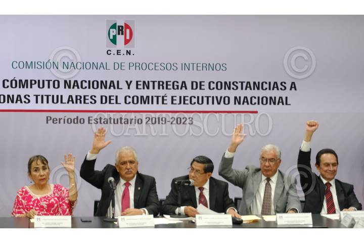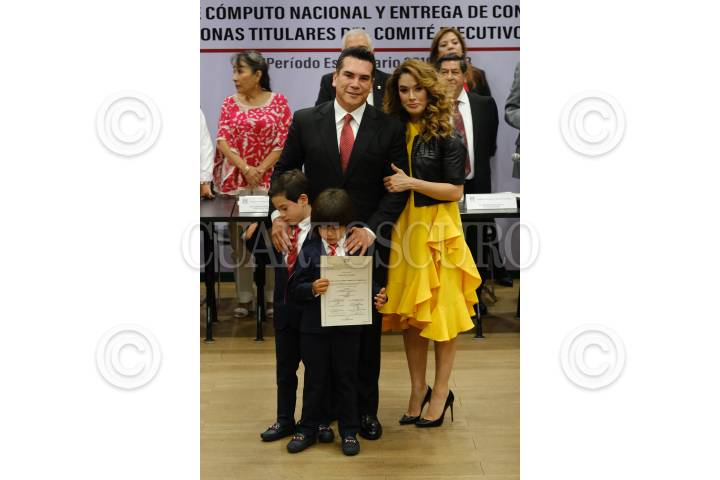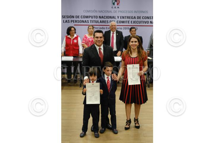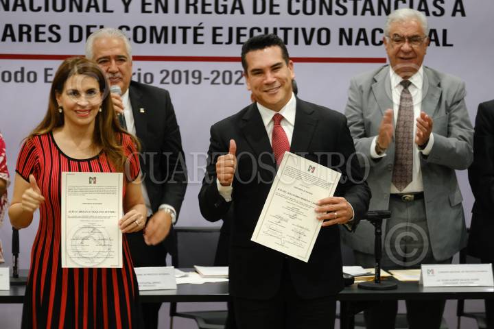 CIUDAD DE MÉXICO, 14AGOSTO2019.- Alejandro Alito Moreno, secretario de Comunicación Institucional, y Carolina Viggiano recibieron la constancia de la dirigen Iá del PRI al ganar la votación en todas las entidades y obtener el 85.07 por ciento de las preferencias el la jornada electoral del domingo pasado. FOTO: GRACIELA LÓPEZ /CUARTOSCURO.COM
