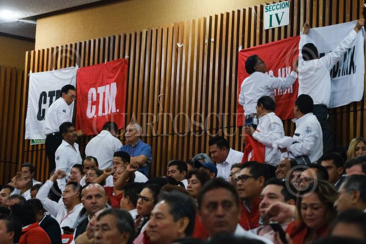 CIUDAD DE MÉXICO, 18AGOSTO2019.- Integrantes de la Confederación de Trabajadores de México (C.T.M) asisitieron a la toma de protesta de Alejandro Alito Moreno y Carolina Viggiano Austria, como Dirigente Nacional y Secretaria General respectivamente del Comité Ejecutivo Nacional para el periodo 2019-2023, el cual se llevó a cabo en el auditorio "Plutarco Elías Calles" de las instalaciones del PRI. FOTO: GRACIELA LÓPEZ / CUARTOSCURO.COM