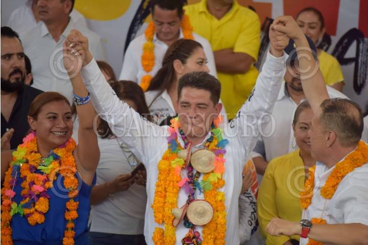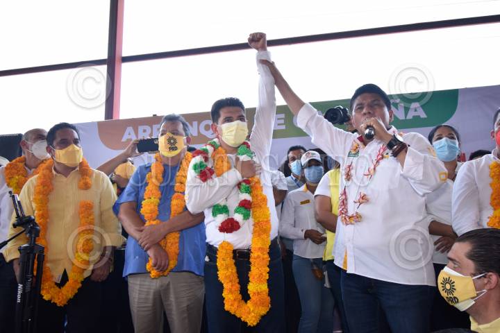 Alejandro Arcos Catalán, candidato a la alcaldía de Chilpancingo por la coalición PRI-PRD, inició su campaña electoral en la cual prometió agua para este municipio. En la imagen Mario Moreno Arcos, candidato a la gubernatura de Guerrero, le alza el brazo.