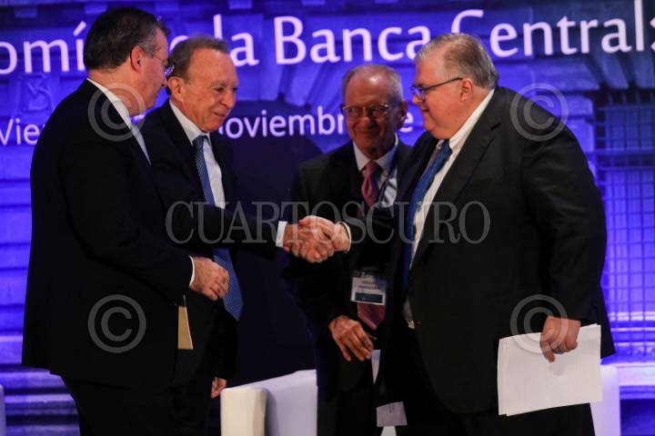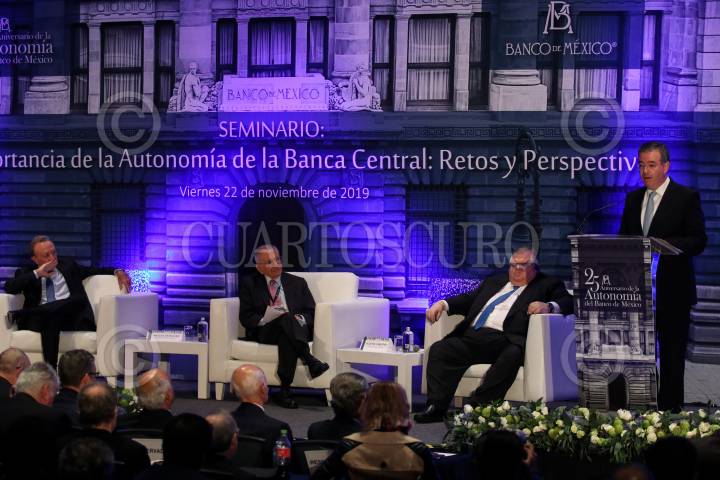 CIUDAD DE MÉXICO, 22NOVIEMBRE2019.- Alejandro Díaz León, gobernador del Banco de México; Guillermo Ortíz, ex gobernador del Banco de México (1998-2009); Miguel Mancera, ex gobernador del Banco de México (1994-1997), y Agustín Carstens, ex gobernador del Banco de México (2010-2017), durante el Seminario “La Importancia de la Autonomía de la Banca Central: Retos y Perspectivas” con motivo del 25 aniversario de la Autonomía del Banco de México. FOTO: GALO CAÑAS /CUARTOSCURO.COM