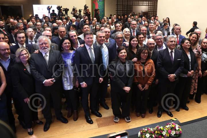 CIUDAD DE MÉXICO, 20DICIEMBTE2024.- César Craviotto, secretario de Gobierno; Clara Brugada, jefa de Gobierno, y Alejandro Encinas, titular de Planeación y Ordenamiento Territorial de CDMX, acompañados de beneficiarios durante la entrega de Escrituras y Testamentos en la Plaza de la Constitución. FOTO: GRACIELA LÓPEZ/CUARTOSCURO.COM