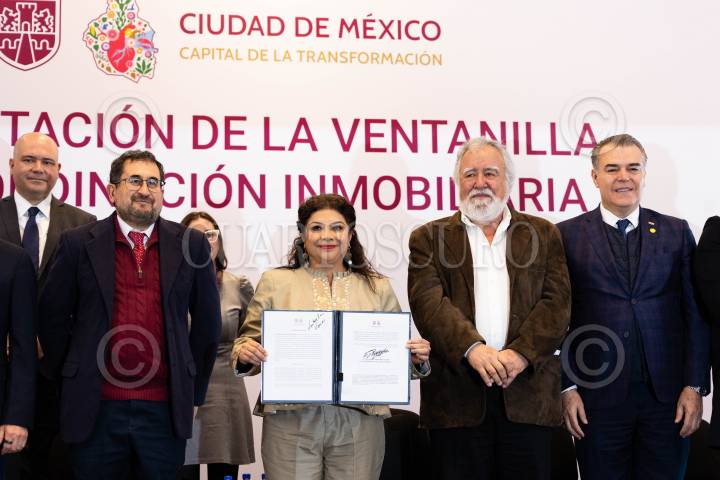 CIUDAD DE MÉXICO, 22ENERO2025.- Clara Brugada, Jefa de Gobierno, encabezó el anuncio de la ventanilla de coordinación inmobiliaria que será un canal director entre las empresas inmobiliarias y el gobierno de la Ciudad de México, para así evitar actos de corrupción. En la imagen acompañan a la mandataria César Cravioto, secretario de Gobierno; Alejandro Encinas, secretario de Planeación y Ordenamiento Territorial, y Francisco Alberto Cervantes Díaz, Presidente de Consejo Coordinador Empresarial. FOTO: MOISÉS PABLO/CUARTOSCURO.COM