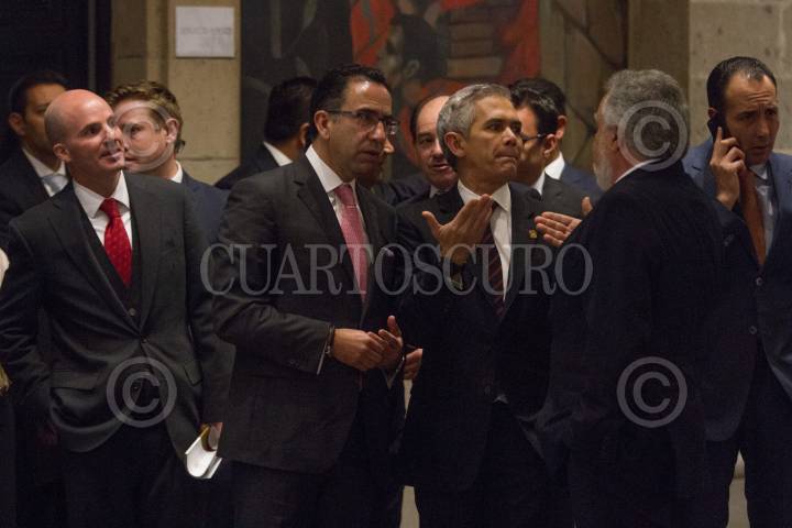 CIUDAD DE MÉXICO, 06DICIEMBRE2017.- José Antonio González Anaya, secretario de Hacienda; Javier Lozano Alarcón, senador del PAN; Miguel Ángel Mancera, Jefe de Gobierno, y Alejandro Encinas Rodríguez, senador independiente, al finalizar la ceremonia de entrega de la medalla Belisario Domínguez, en la vieja casona de Xicoténcatl. FOTO: MOISÉS PABLO /CUARTOSCURO.COM