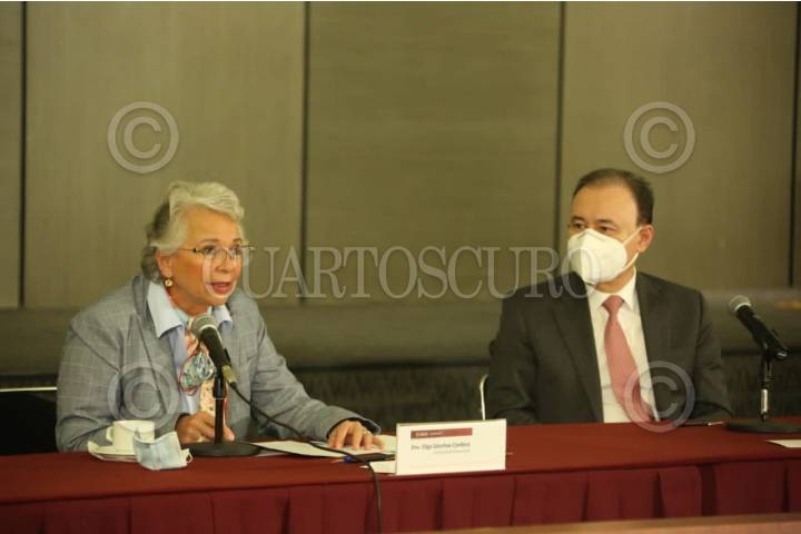 Olga Sánchez Cordero Titular de Secretaría de Gobernación y Alfonso Durazo Montaño de Seguridad y Protección Ciudadana, hablando durante el evento donde firmaron convenio para facilitar el intercambio de información entre instituciones e impulsar la estrategia de seguridad de la Cuarta Transformación.. El mensaje principal del evento fue la cooperación, coordinación y corresponsabilidad interinstitucional.