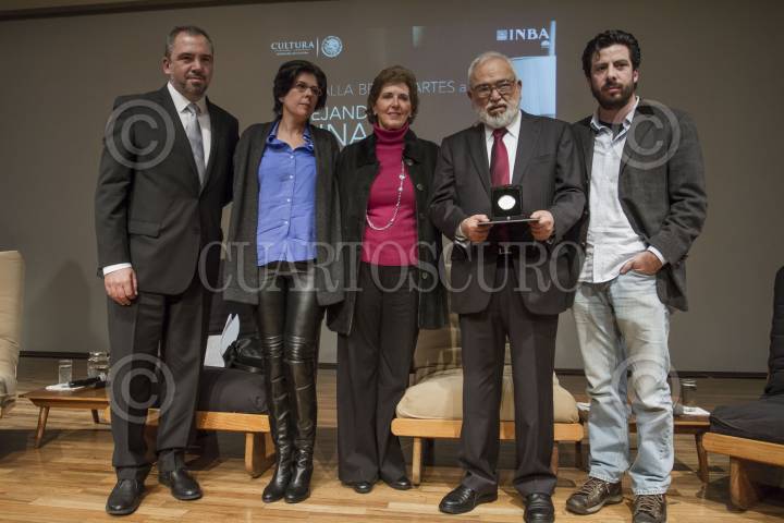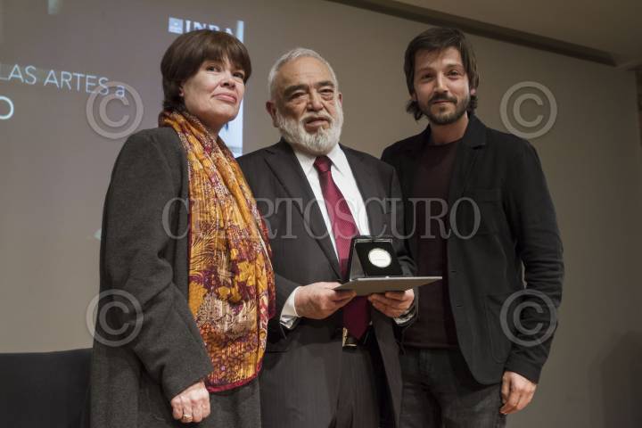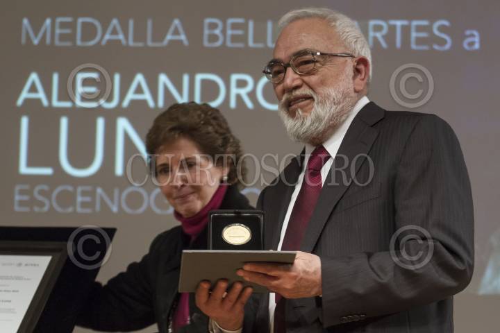 MÉXICO, D.F., 13ENERO2016.- El escenógrafo Alejandro Luna Ledesma recibió la medalla Bellas Artes por su contribución al desarrollo de las artes escénicas en México, de manos de María Cristina García Cepeda, titular del INBA, en una ceremonia en la Sala Manuel M. Ponce del Palacio de Bellas Artes. FOTO: ISAAC ESQUIVEL /CUARTOSCURO.COM