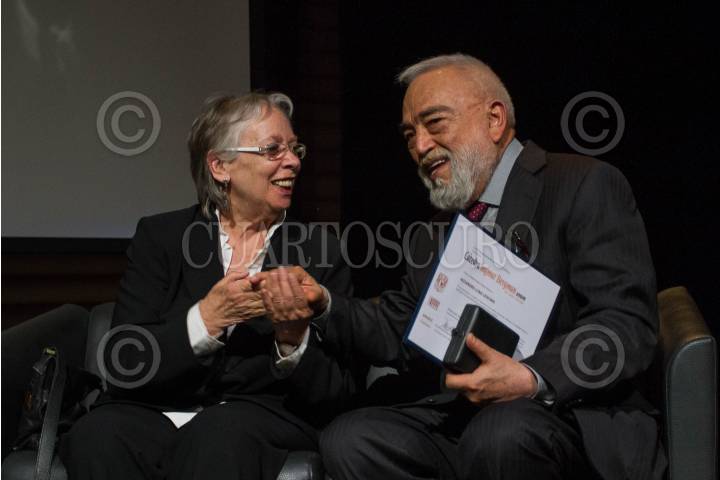 CIUDAD DE MÉXICO, 24AGOSTO2016.- El escenógrafo mexicano Alejandro Luna Ledesma recibió de manos de María Teresa Uriarte Castañeda, titular de Difusión Cultural UNAM, la medalla "Cátedra Ingmar Bergman" de la UNAM, por su trayectora en cine y teatro. FOTO: ISAAC ESQUIVEL /CUARTOSCURO.COM