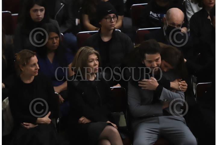 Diego Luna es consolado por sus hijos Jerónimo Y Fiona durante el homenaje póstumo al arquitecto y escenógrafo Alejandro Luna en el Palacio de Bellas Artes.